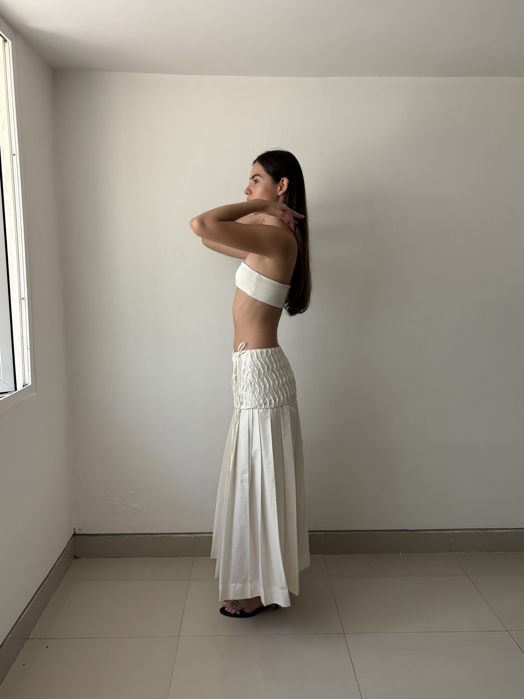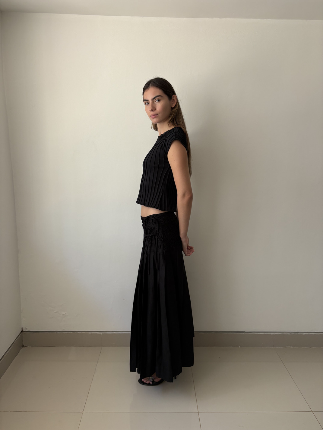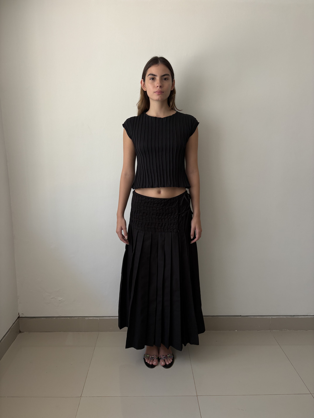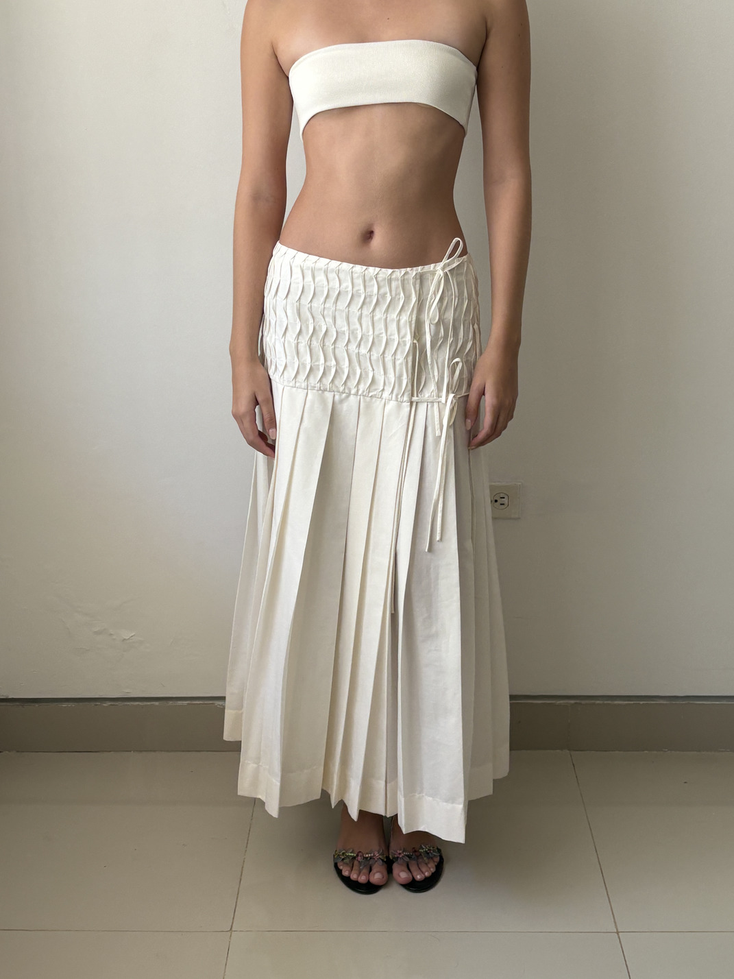 Long wrap-style skirt with side tie closures. Its design combines a textured upper section with vertical undulating pleats and a pleated skirt.
