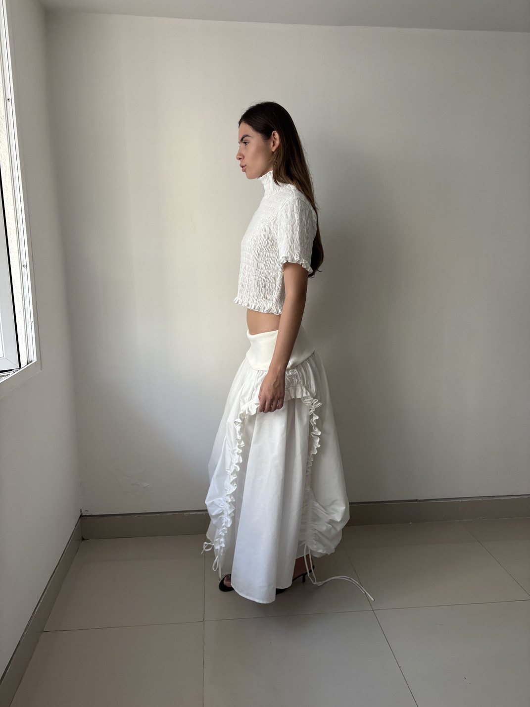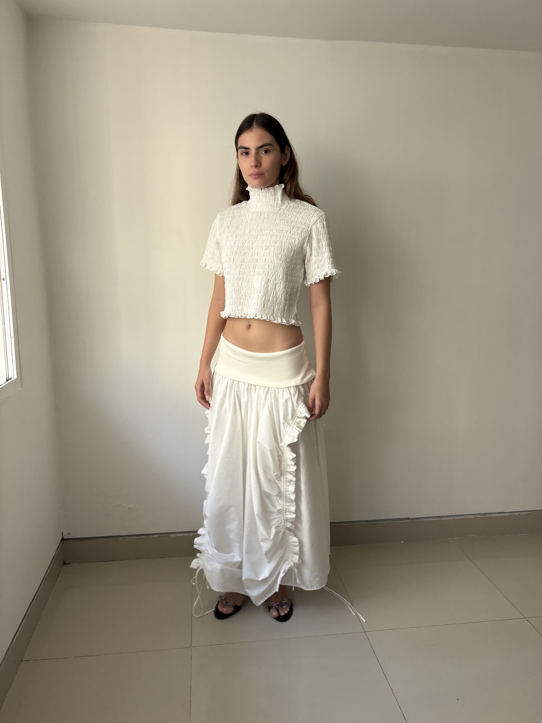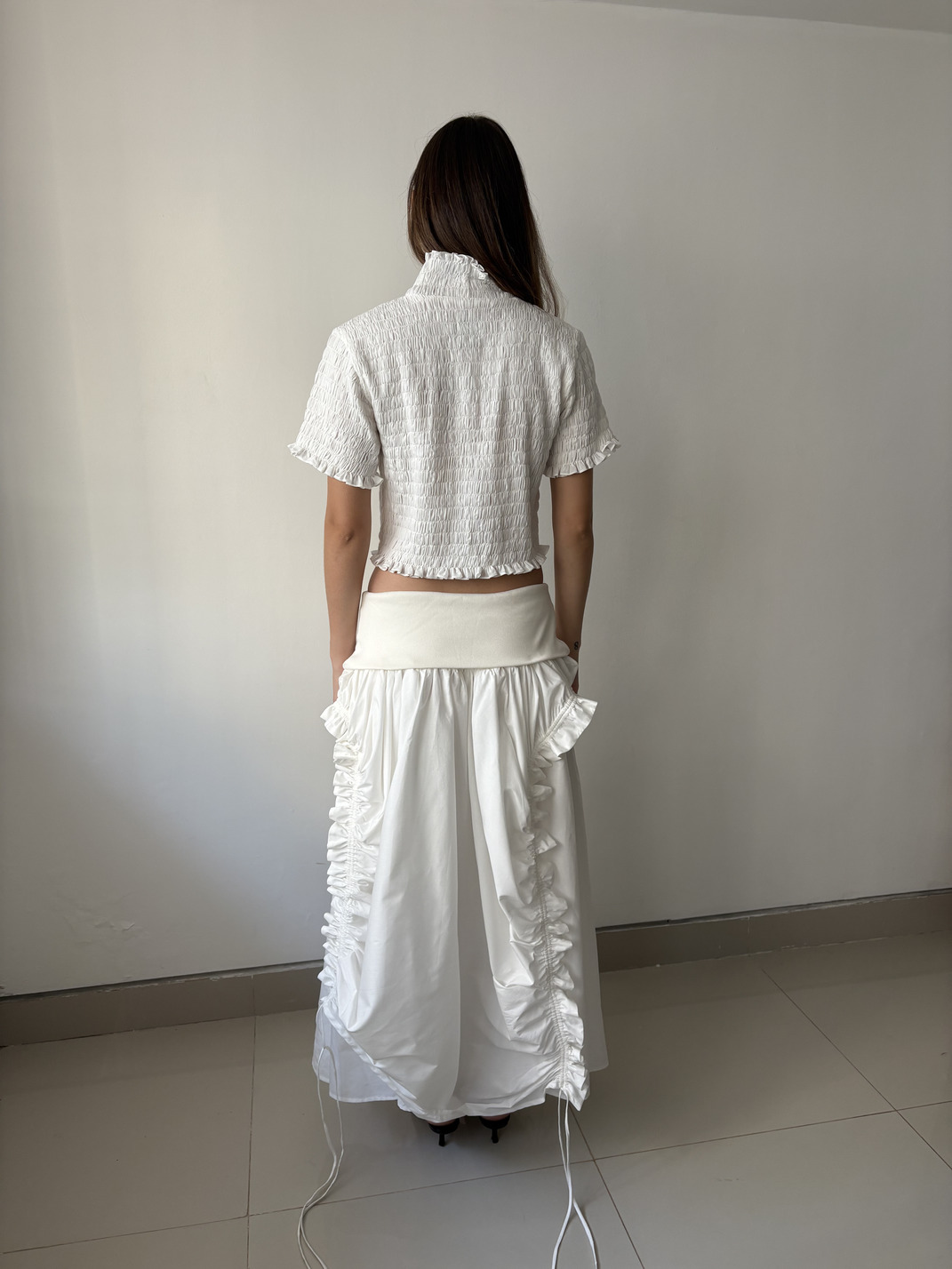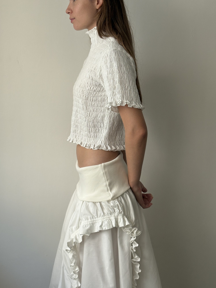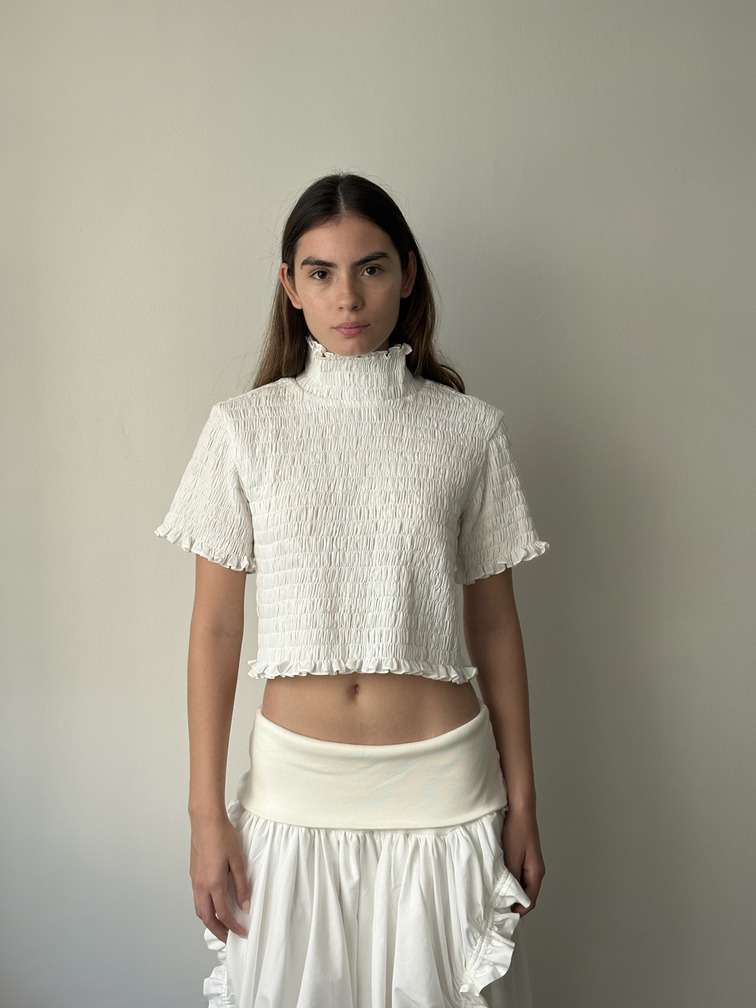 Cropped top with a high neckline, short sleeves, and a gathered texture.