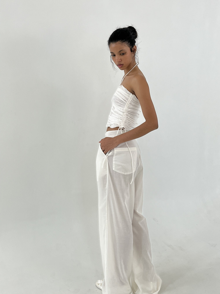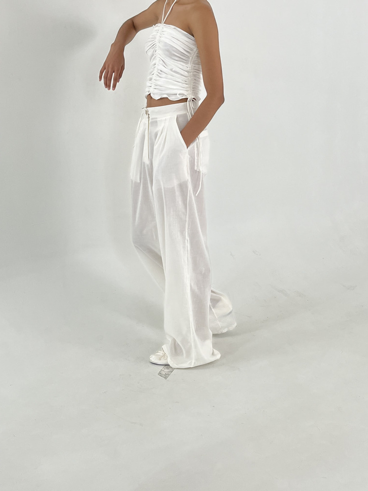 Pantalón de tiro medio con pinzas frontales, pierna amplia y acabado ligeramente translúcido.