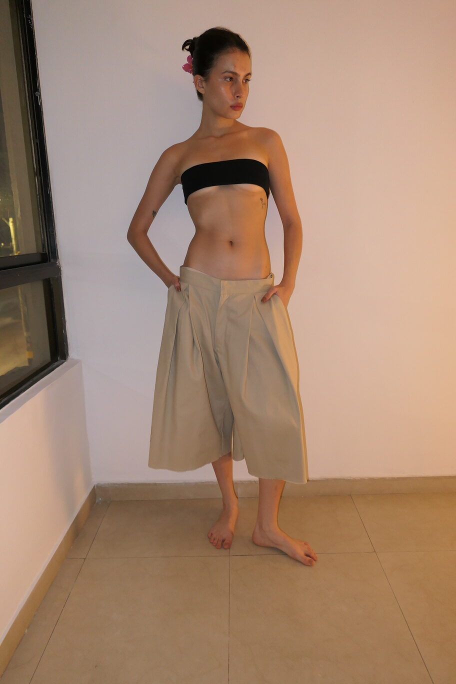Bermudas holgadas de tiro bajo con pinzas frontales, bolsillos laterales y traseros.