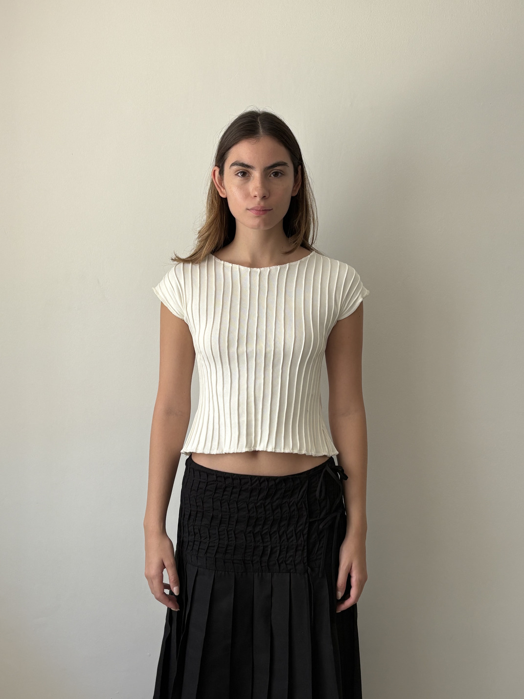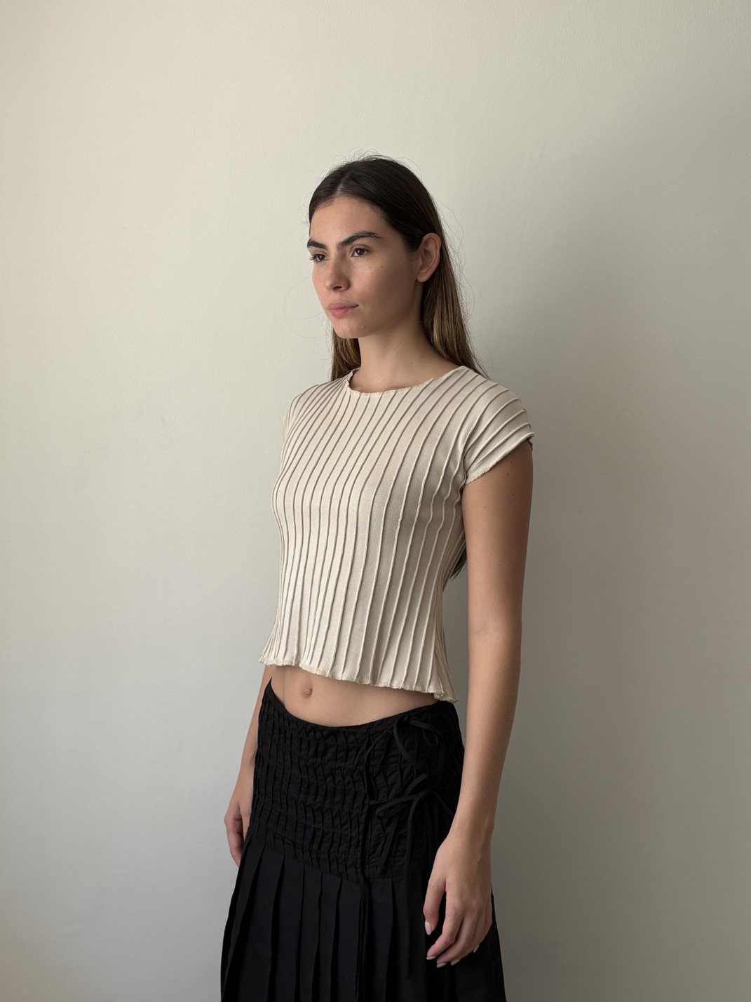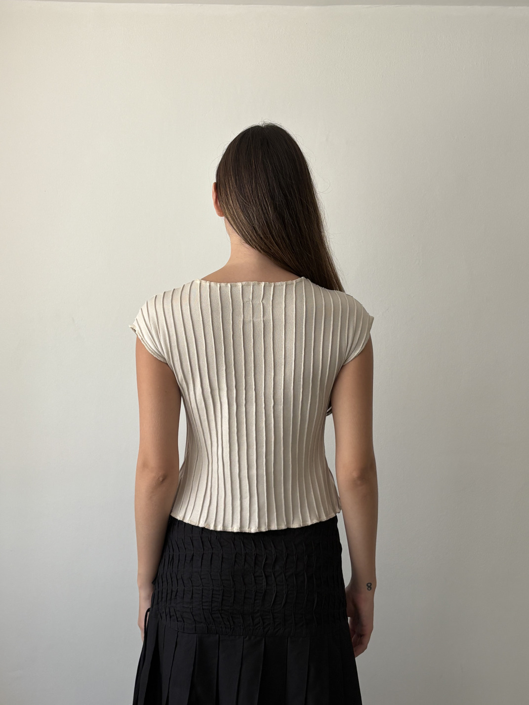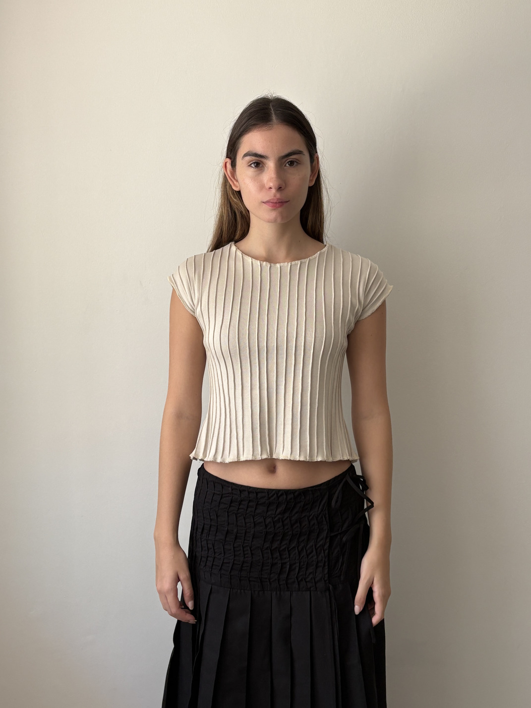 Top corto de orilla limpia con sobrehilado y costuras verticales hechas a mano y rellenas de lana.