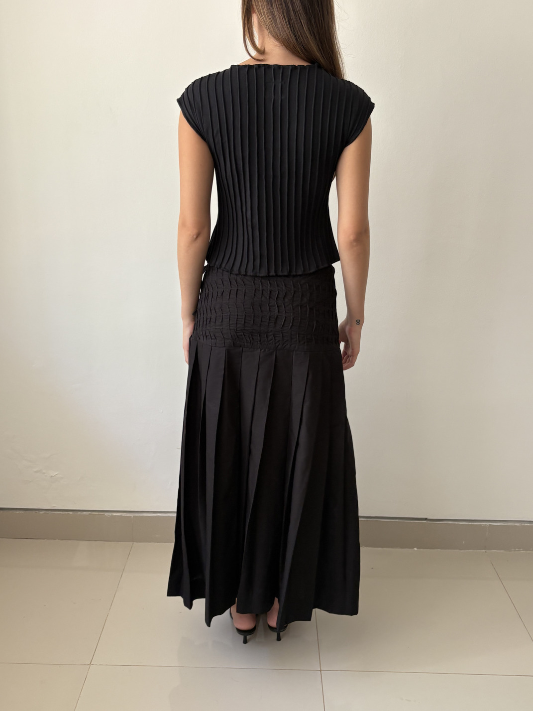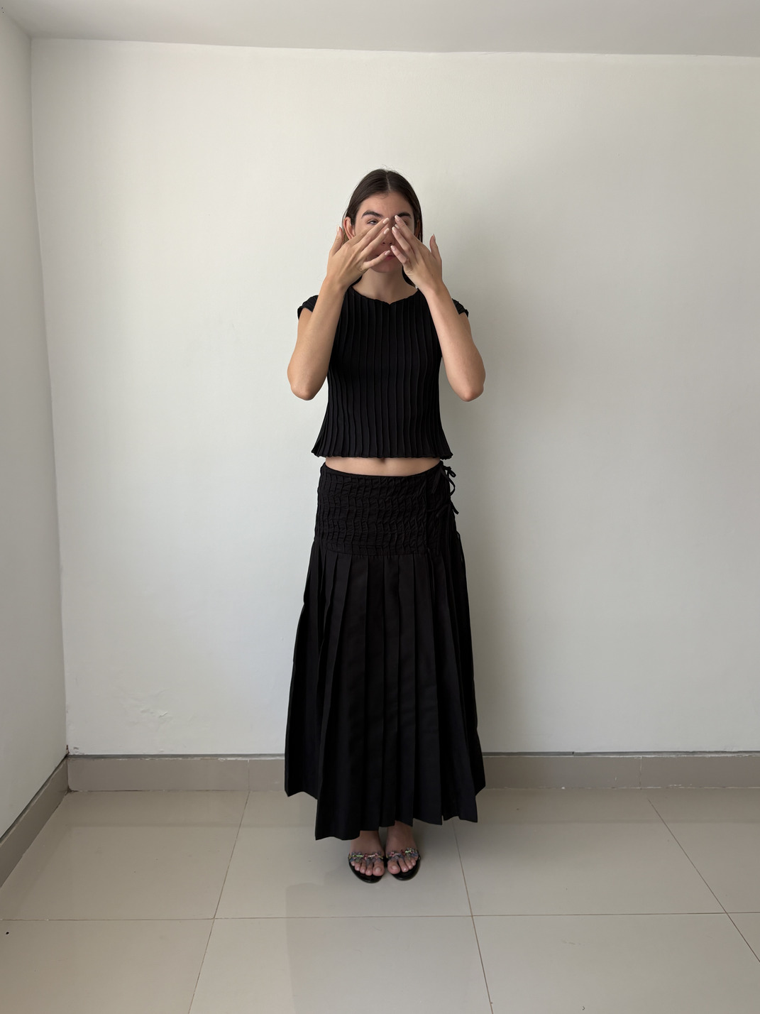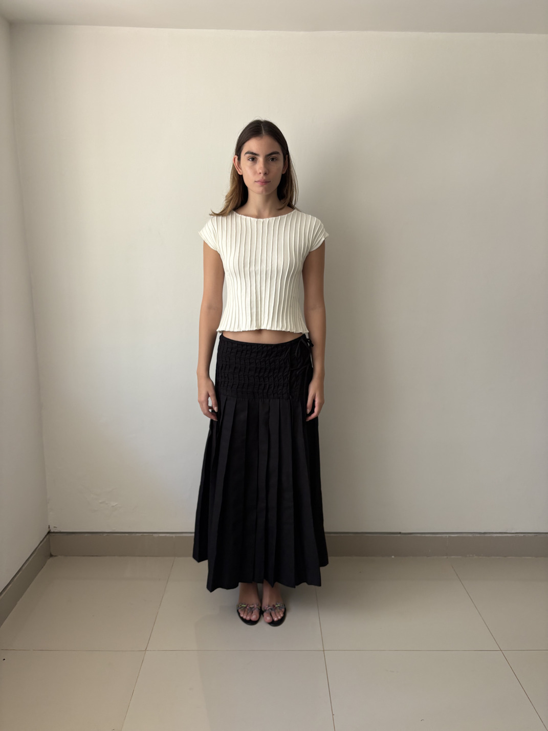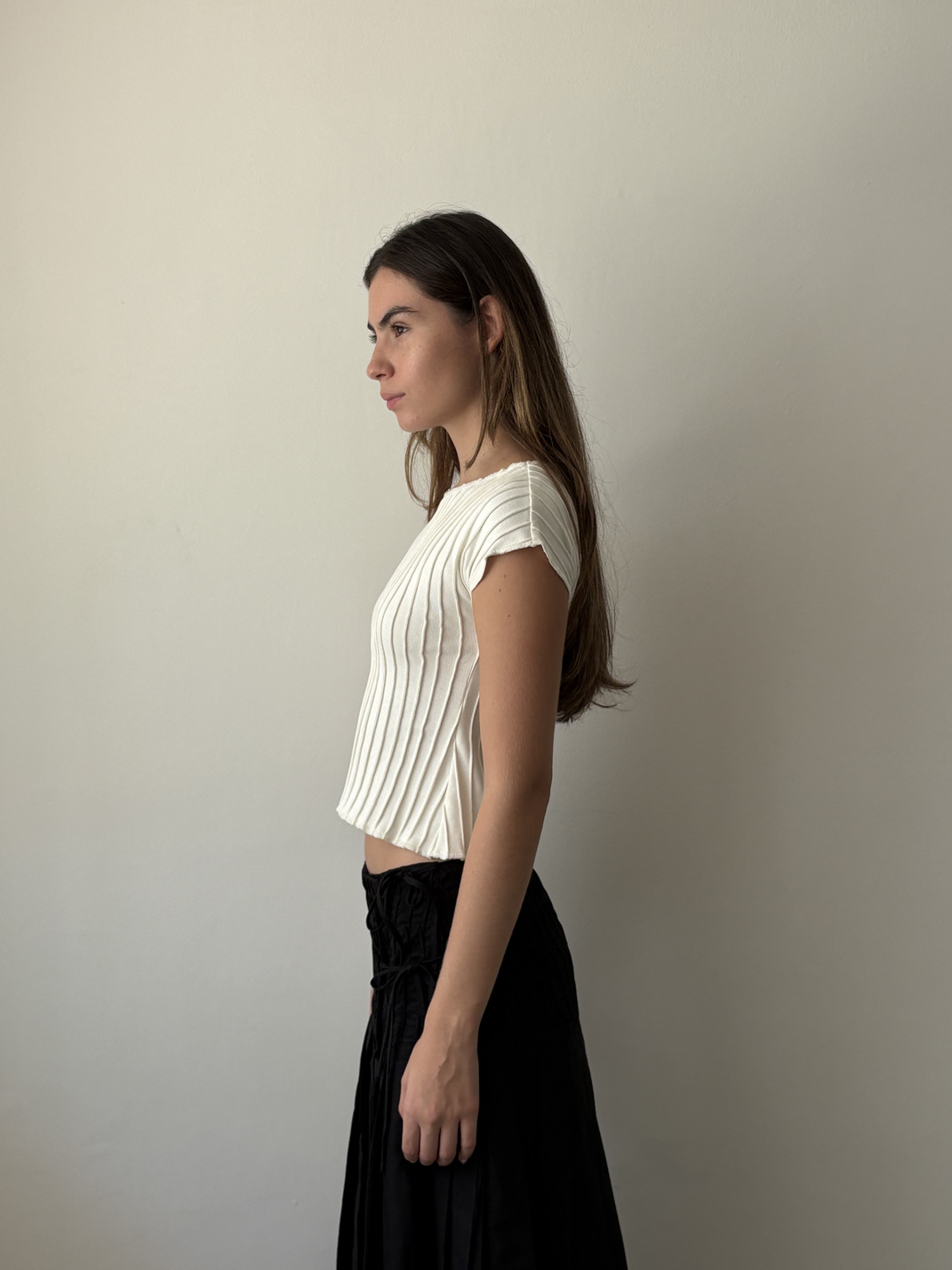 Top corto de orilla limpia con sobrehilado y costuras verticales hechas a mano y rellenas de lana.