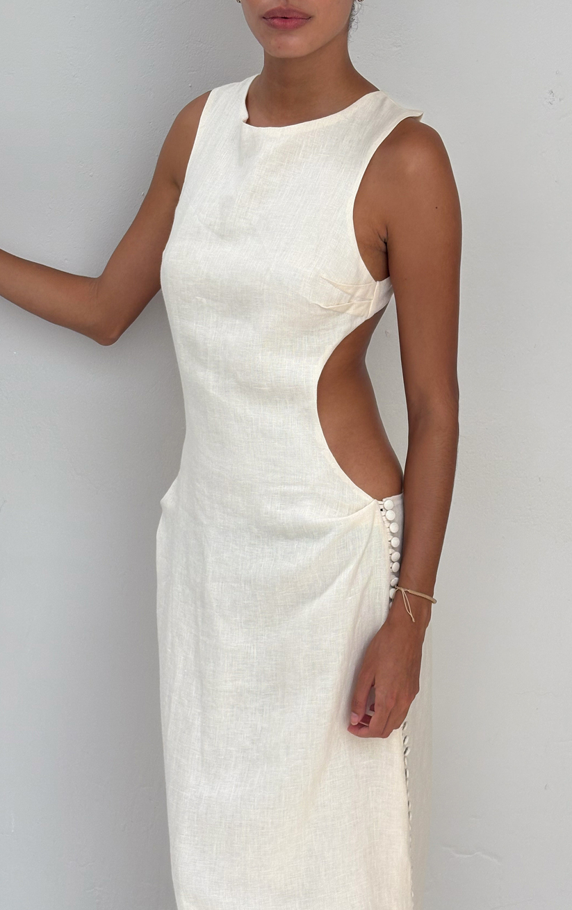 Vestido largo en lino con silueta recta, abertura en la espalda y botones forrados.