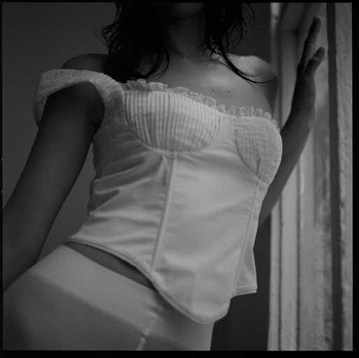 Top tipo corset con escote corazón, copas con pliegues, tiras fruncidas y volantes alrededor del escote.